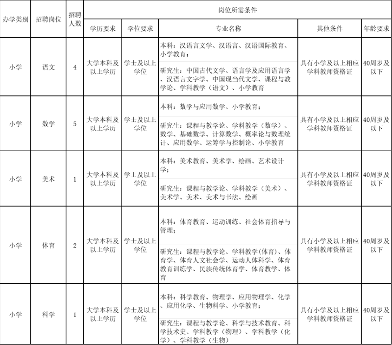 小學教師計劃招聘3名。其中:小學語文2人,小學數學1人。