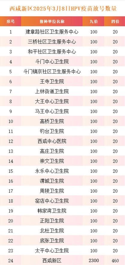 2025年3月8日上午10:00開始。本次西咸新區開放23個接種門診號源,接種日期從3月9日起至4月7日共30天,23個接種門診支持四價HPV疫苗預約460人,九價HPV疫苗預約2300人。預約成功,系統提示。