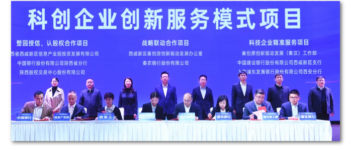 秦農銀行、中國銀行、陜西股權交易中心、浦發銀行等金融機構與新區秦創原總窗口科技金融服務體系簽約,將通過開辟綠色通道,整體授信、“認股權+科創園區”等創新業務,為新區科技企業提供精準高效的金融服務。