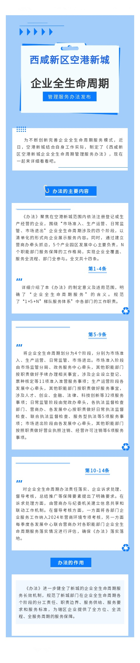 《西咸新區空港新城企業全生命周期管理服務辦法》已經新城 2024年9月5日第10 次主任辦公會審議通過,現予以印發,請認真貫徹落實。