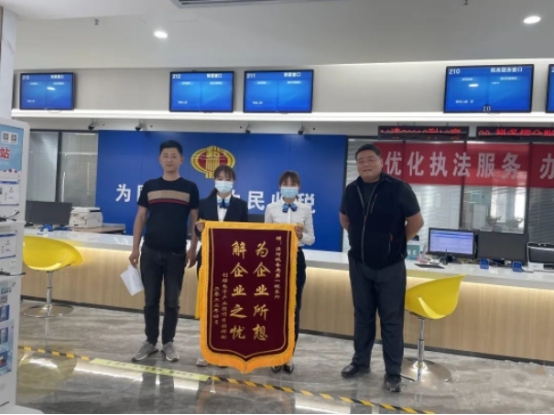 創維電子產業園項目指揮部工作人員表示:“因項目辦理事項較多,此時正在辦理業務的納稅人也排滿了窗口,以為需要耗時一整天。就在此時,政務大廳幫辦崗的工作人員主動問詢,全程指導幫辦,帶領我在自助區預審資料,并指導我進行資料填報,在此基礎上工作人員將資料帶給辦事窗口,由窗口工作人員一窗受理,即時辦理,很快就幫我辦結了稅務第三方協議的簽訂,以及國有土地使用權出讓的申報及繳納。他們用暖心和真心換得了我們的舒心和省心,所以特地制作一面錦旗表達我們的感謝之情。”