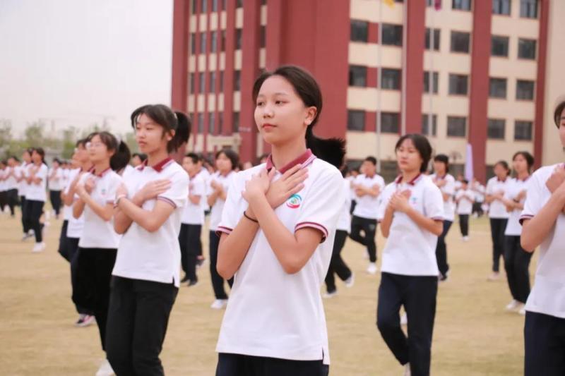 英姿颯爽的國旗護衛(wèi)隊邁著堅定整齊的步伐,護衛(wèi)著五星紅旗步入會場。伴隨著雄壯嘹亮的國歌聲,鮮艷的國旗冉冉升起,奮進的青春力量,驟然在校園里凝聚升騰。