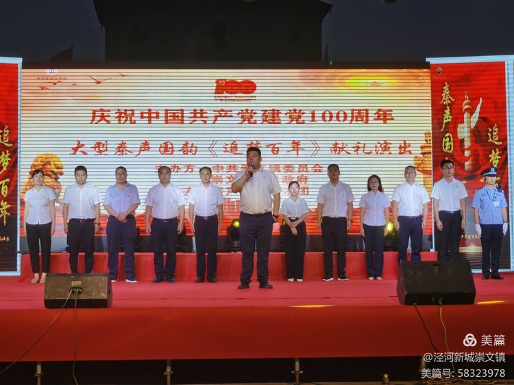 涇河新城黨委副書記劉洪武,黨委組織部部長吉煒濤,黨委宣傳部部長馮曉榮,黨委政法工作部部長楊光悅,黨委宣傳部副部長王洋,黨委統戰部副部長錢咪咪,崇文鎮領導班子全體成員,與轄區群眾近600人共同觀看演出,一齊慶祝黨的生日。