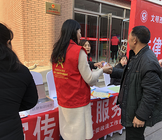 為深入貫徹黨的十九大精神,推進新城新時代文明實踐志愿服務再上新臺階,2019年12月5日秦漢新城黨委政法工作部應新城文明辦相邀,參加周陵街辦周禮佳苑開展的“國際志愿者”文明實踐活動,黨委政法工作部司法科現場開展文明實踐法治宣傳活動。
