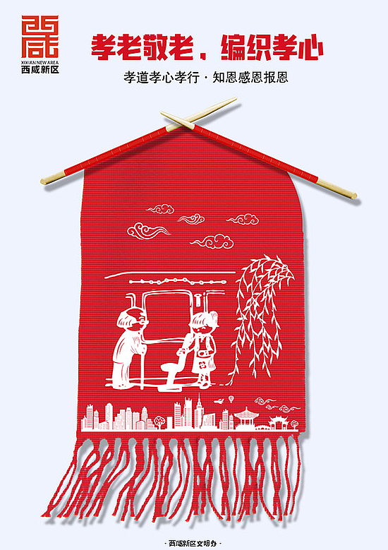 作品(系列)創意來源于織毛衣,毛衣一針一線,表達愛意溫暖,如文明,如孝心,一點一滴匯聚而成。弘揚孝道、傳遞孝心需要你我共同努力。只有人人參與,才能弘揚優秀傳統美德,弘揚孝文化。