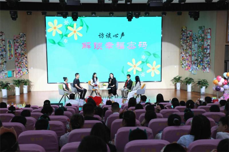 本次活動從家校共育、課程育心、活動育心三大篇章展開。“家校共育”篇章,學(xué)生與家長借古詩朗誦,回憶成長,喚起親情共鳴;“課程育心”篇章,代冰潔老師以“幸福五要素”啟發(fā)學(xué)生追尋幸福,國家二級心理咨詢師孟蓉老師從專業(yè)角度解答學(xué)生、家長、教師咨詢的問題并提出好的建議;“活動育心”篇章,孩子們暢談夢想,表達感恩。