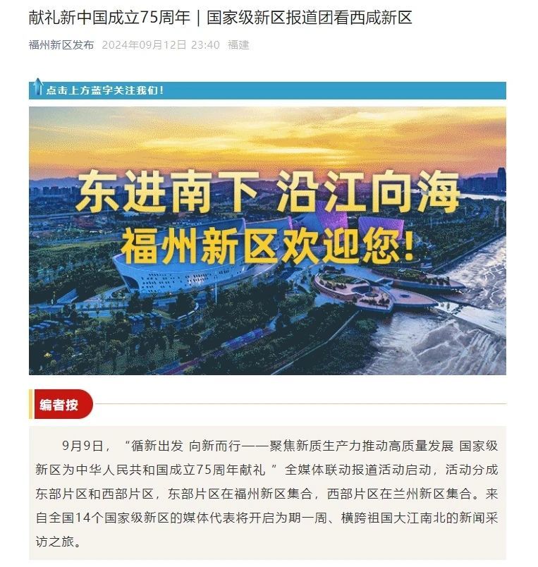 9月9日起,由蘭州新區(qū)和福州新區(qū)融媒體中心發(fā)起,聯(lián)合濱海新區(qū)、兩江新區(qū)、南沙新區(qū)、西咸新區(qū)、貴安新區(qū)、青島西海岸新區(qū)、天府新區(qū)、湘江新區(qū)、江北新區(qū)、滇中新區(qū)、哈爾濱新區(qū)、雄安新區(qū)等國(guó)家級(jí)新區(qū)融媒體中心,策劃推出“循新出發(fā) 向新而行——聚焦新質(zhì)生產(chǎn)力 推動(dòng)高質(zhì)量發(fā)展”全媒體聯(lián)動(dòng)報(bào)道活動(dòng)正式啟動(dòng)?;顒?dòng)以新時(shí)代、新質(zhì)生產(chǎn)力、國(guó)家級(jí)新區(qū)“三新”為抓手,通過全媒體聯(lián)動(dòng)、現(xiàn)場(chǎng)直播、特色景區(qū)打卡、組團(tuán)采訪等方式,展現(xiàn)國(guó)家級(jí)新區(qū)發(fā)展新質(zhì)生產(chǎn)力,推動(dòng)高質(zhì)量發(fā)展的輝煌成就和亮點(diǎn)舉措。