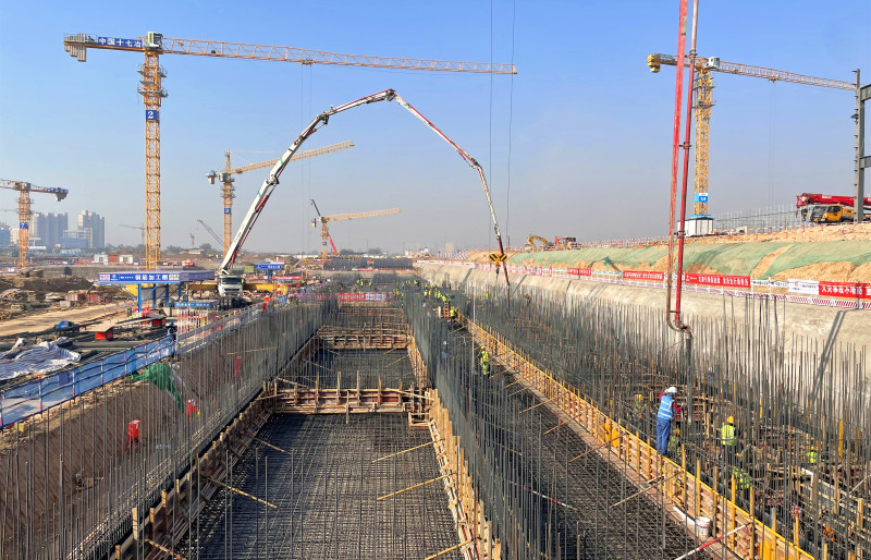 在能源金貿區文教園片區WJ01-01地塊項目施工現場,春節期間仍是一幅熱火朝天的建設景象,8臺天泵同時進行混凝土澆筑,項目進度穩步推進。