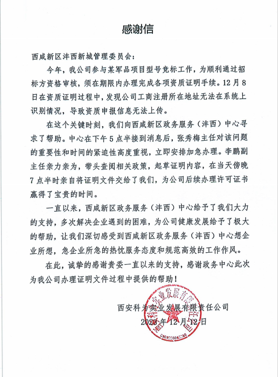 信中表示:我司參與某軍品項目型號競標工作,在資質(zhì)證明過程中,發(fā)現(xiàn)公司所在地址無法在系統(tǒng)上識別情況,導致資質(zhì)申報信息無法上傳。在西咸新區(qū)政務(wù)服務(wù)(灃西)中心的幫助下,當天將證明文件交給了我們,為我司后續(xù)辦理許可證書贏得了寶貴的時間,給予了我們大力的支持,多次解決企業(yè)遇到的困難,為公司健康發(fā)展給予了極大的幫助。