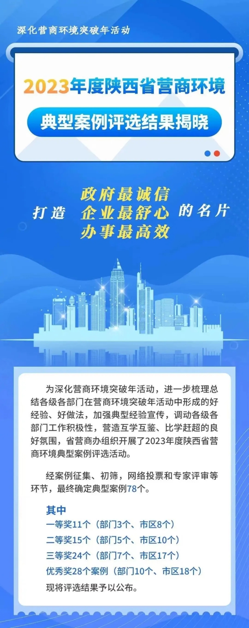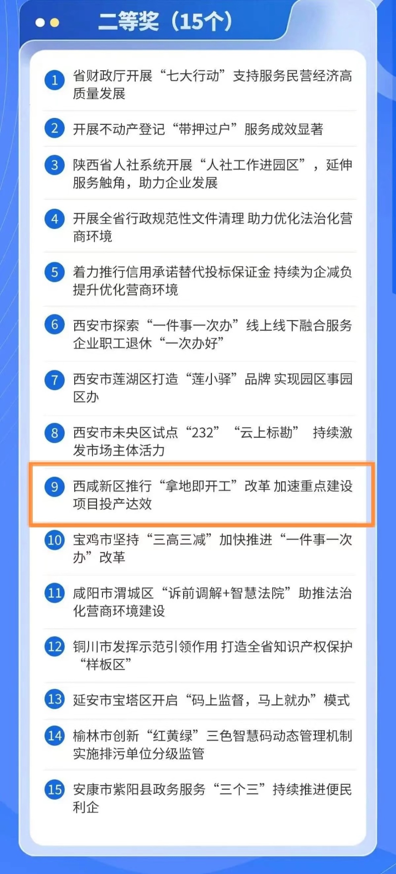 2月20日,陜西省優化提升營商環境工作領導小組辦公室發布“2023年度陜西省營商環境典型案例”評選結果,其中《西咸新區推行“拿地即開工”改革 加速重點建設項目投產達效》案例通過初篩、網絡投票和專家評審等環節,獲評2023年度陜西省營商環境典型案例二等獎。