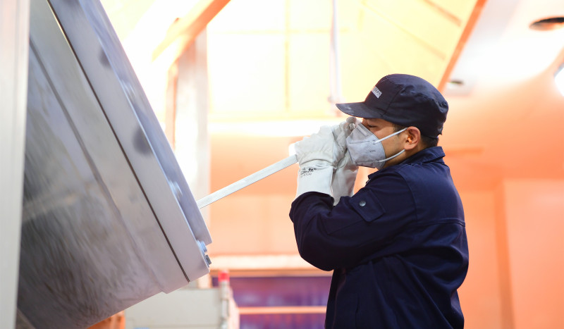 為了提高石英坩堝的純度,圣寶鴻專門建立了裝配式凈化車間和空氣吹淋室。在吹除車間員工和物體表面附著塵埃的同時,也防止未凈化的空氣進入潔凈區域。