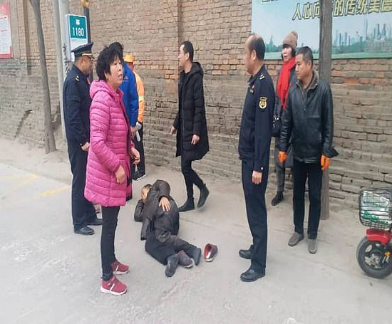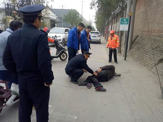 當(dāng)天上午10時許,永樂鎮(zhèn)綜合行政執(zhí)法大隊(duì)大隊(duì)長徐曉峰帶領(lǐng)大隊(duì)執(zhí)法隊(duì)員對轄區(qū)進(jìn)行日常巡查。在巡查至永樂鎮(zhèn)永豐村村口1180公交站牌處發(fā)現(xiàn)馬路旁圍滿了群眾,一名老者躺在地上動彈不得,一輛電動車倒在馬路旁,大隊(duì)長徐曉峰立即上前進(jìn)行查看,經(jīng)了解,老者在騎行過程中因自身未掌握好車速車輛傾斜導(dǎo)致摔倒,目前腿部疼痛難忍。徐曉峰立即拿出電話聯(lián)系鎮(zhèn)衛(wèi)生院并組織大隊(duì)執(zhí)法隊(duì)員對周邊圍觀疏散路旁圍觀群眾。