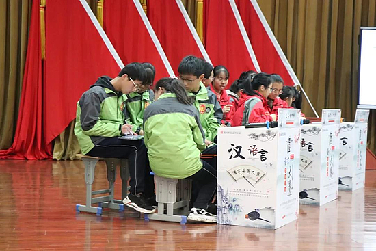 比賽現場,主持人播報題目,各參賽選手認真聽題,沉著思考,冷靜作答,規范書寫,場下的同學凝息靜氣、目不轉睛地盯著顯示屏,隨時為自己學校的參賽選手加油喝彩。隨著比賽的深入,聽寫的難度不斷加大,現場氣氛越來越緊張,同學們時而歡呼雀躍、時而惋惜哀嘆,整個比賽扣人心弦。