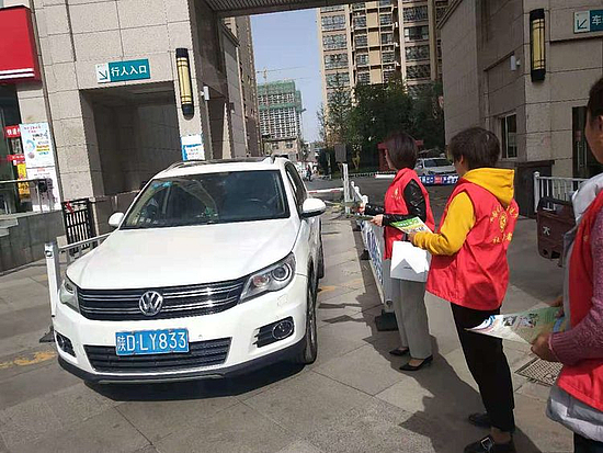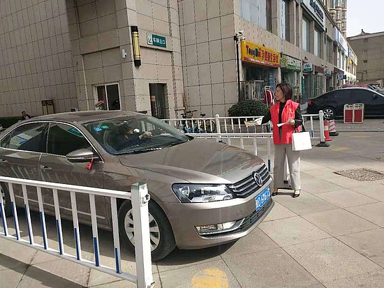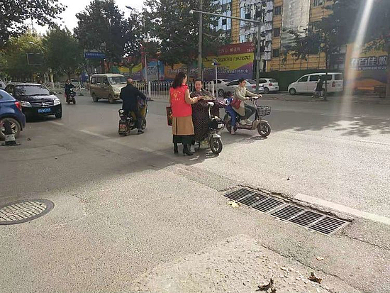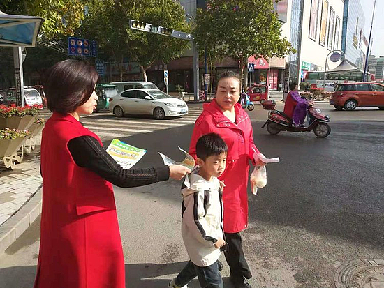 南街社區副書記帶領志愿者在學校門前及主要路口向過路司機宣傳車讓人宣傳活動。