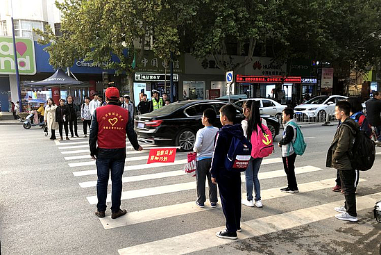 (志愿者勸導橫穿馬路的兩位老人)