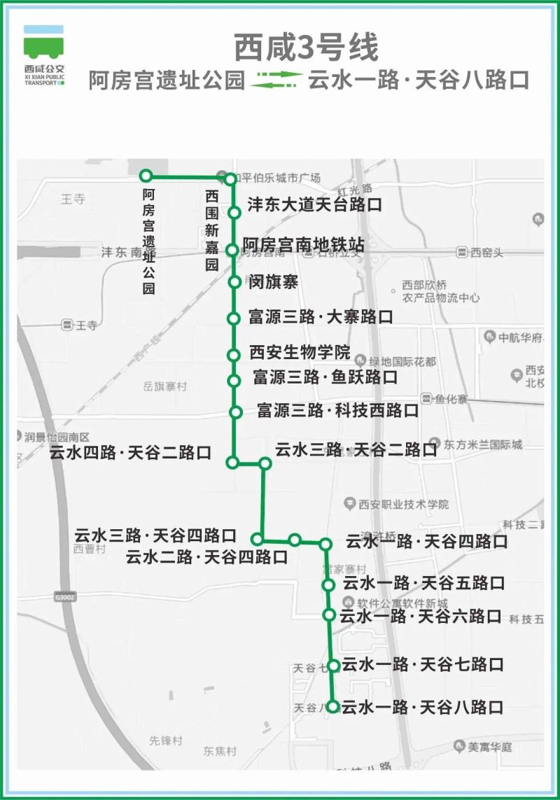 阿房宮遺址公園、西圍新嘉園、灃東大道天臺路口、西安生物學院、阿房宮南地鐵站、閔旗寨、富源三路·大寨路口、富源三路·魚躍路口、富源三路·科技西路口、云水四路·天谷二路口、云水三路·天谷二路口、云水三路·天谷四路口、云水二路·天谷四路口、云水一路·天谷四路口、云水一路·天谷五路口、云水一路·天谷六路口、云水一路·天谷七路口、云水一路·天谷八路口