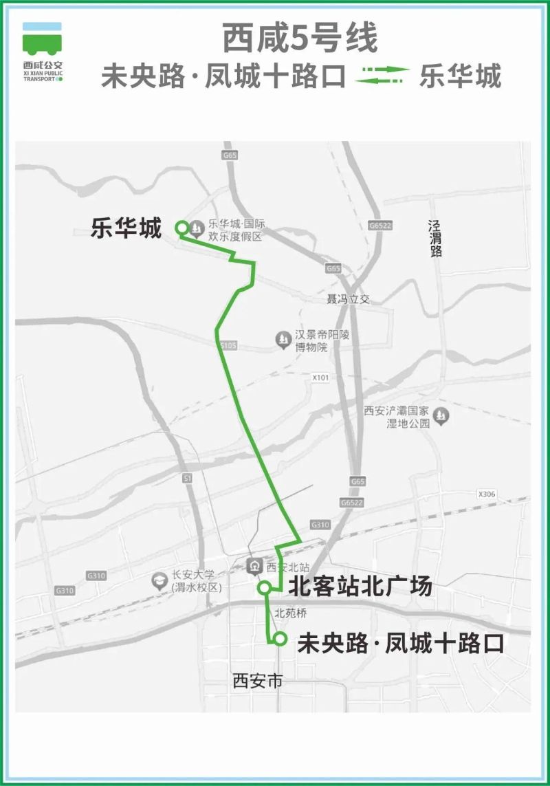 該線路由“未央路·鳳城十路口”始發,沿鳳城路、文景路、元朔大道、尚華路、正陽大道、灃涇大道行駛至“樂華城”