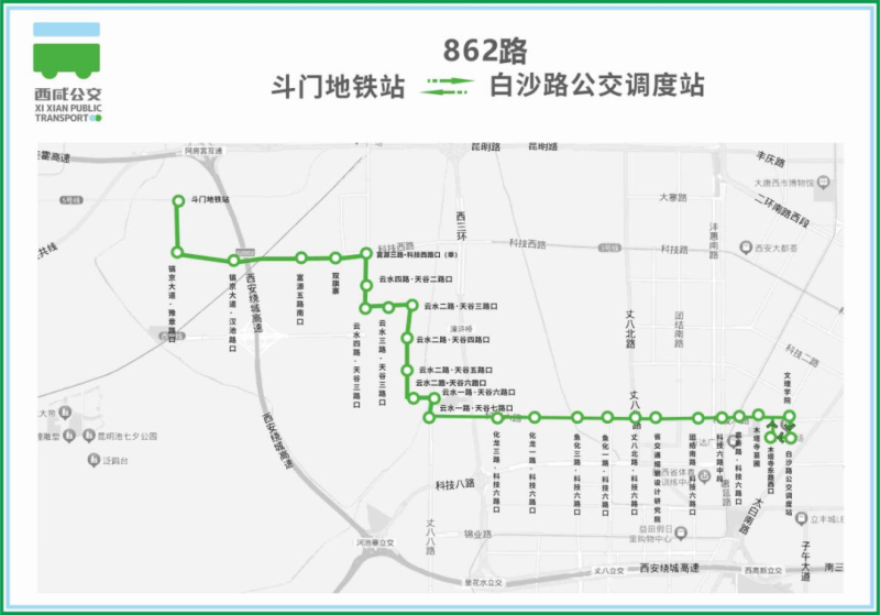 調(diào)整后停靠站點(diǎn):斗門地鐵站→鎬京大道·豫章路口→鎬京大道·漢池路口→富源五路南口→雙旗寨→富源三路·科技西路口(單上行)→云水四路·天谷二路口→云水四路·天谷三路口→云水三路·天谷三路口→云水二路·天谷三路口→云水二路·天谷四路口→云水二路·天谷五路口→云水二路·天谷六路口→云水一路·天谷六路口→云水一路·天谷七路口→化龍三路·科技六路口→化龍一路·科技六路口→魚化三路·科技六路口→魚化一路·科技六路口→丈八北路·科技六路口→省交通規(guī)劃設(shè)計(jì)研究院→科技六路·團(tuán)結(jié)南路口→科技六路中段→高新路·科技六路口→木塔寺苗圃→文理學(xué)院(單上行)→木塔寺東路西口(單下行)→白沙路公交調(diào)度站