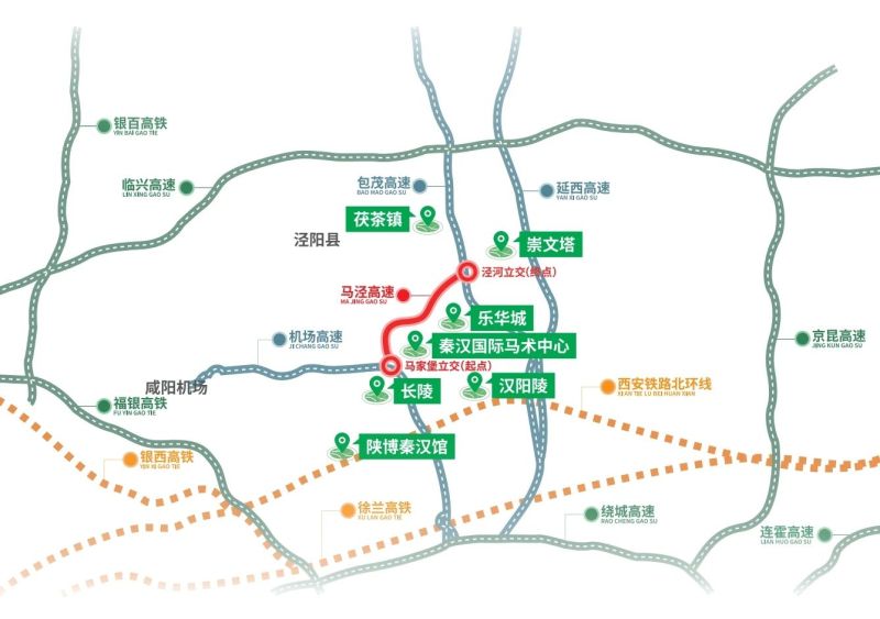 馬涇高速由陜西交控集團負責(zé)建設(shè),作為陜西省省級公路網(wǎng)規(guī)劃的重要聯(lián)絡(luò)線,連接了機場高速與G65包茂高速公路。項目起點位于機場專用高速馬家堡立交,終點位于包茂高速涇河新城立交。路線全長8.3公里,按雙向六車道高速公路標準設(shè)計,路基寬度33.2米,設(shè)計速度100公里/小時,沿線主要經(jīng)過西咸新區(qū)秦漢新城、涇河新城。