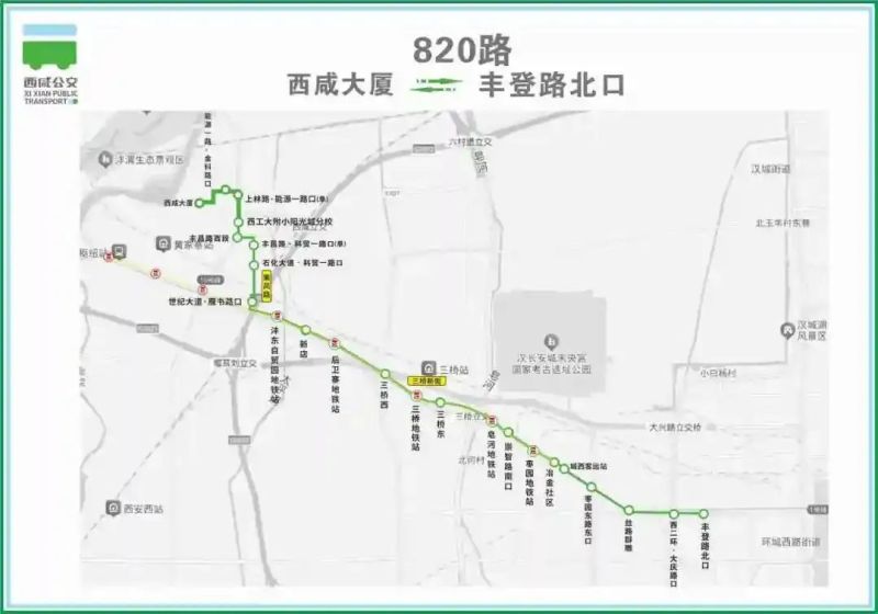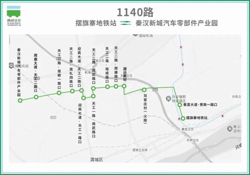 自擺旗寨地鐵站始發,經秦直大道、咸宋路、周成路、天工二路至秦漢新城汽車零部件產業園。
