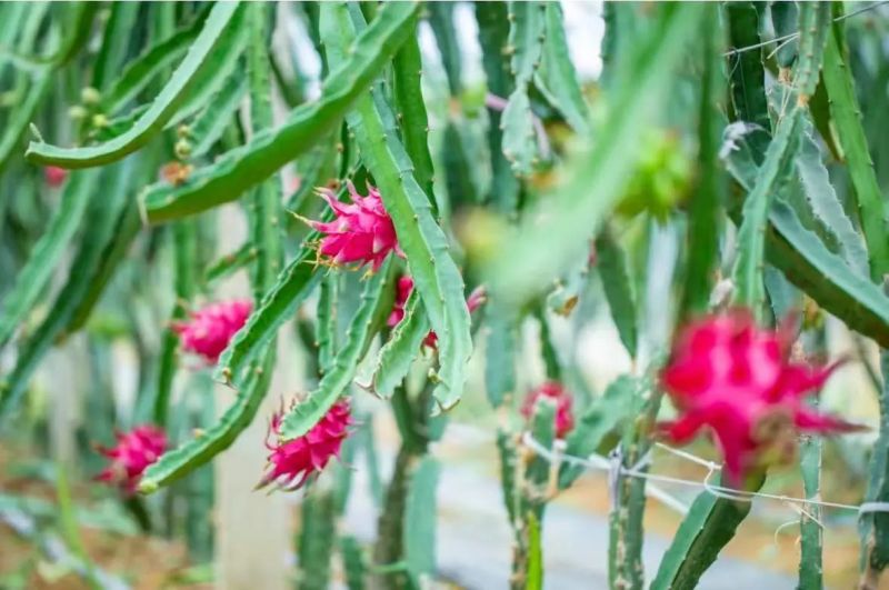 走進農場,一排排超級大的火龍果整齊排列,在藤蔓間纏繞,好像一個個燈籠點綴在萬綠叢中,喜歡“嘗鮮”的游客一定不能錯過。