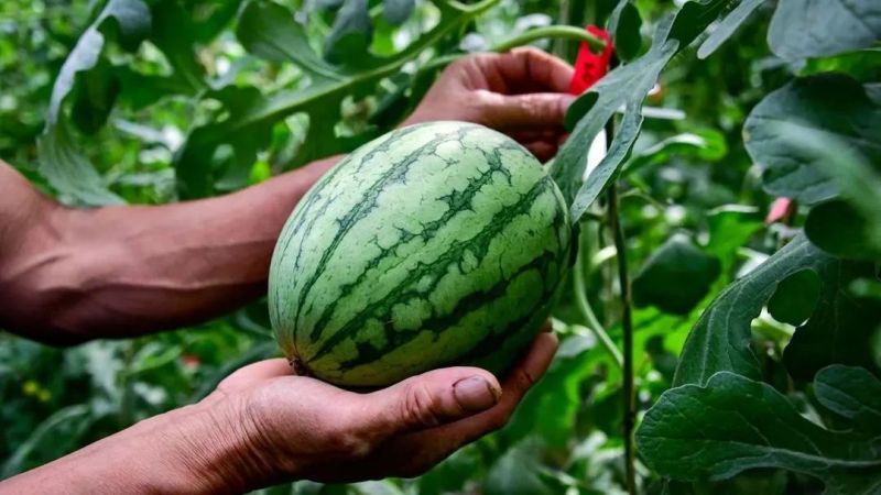 踏入這片種植基地,就仿佛走進了一幅色彩斑斕的田園畫卷。嫩綠的生菜葉片舒展,修長的黃瓜掛在藤蔓上隨風搖擺,紅冰糖小西瓜懸在藤蔓上,表皮綠如翡翠,瓤色紅似瑪瑙。每個西瓜頭上頂著“出生日期”,需要50天左右才能成熟,屆時糖度能到12~14度。