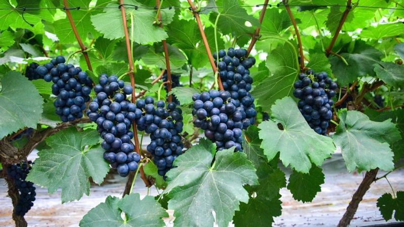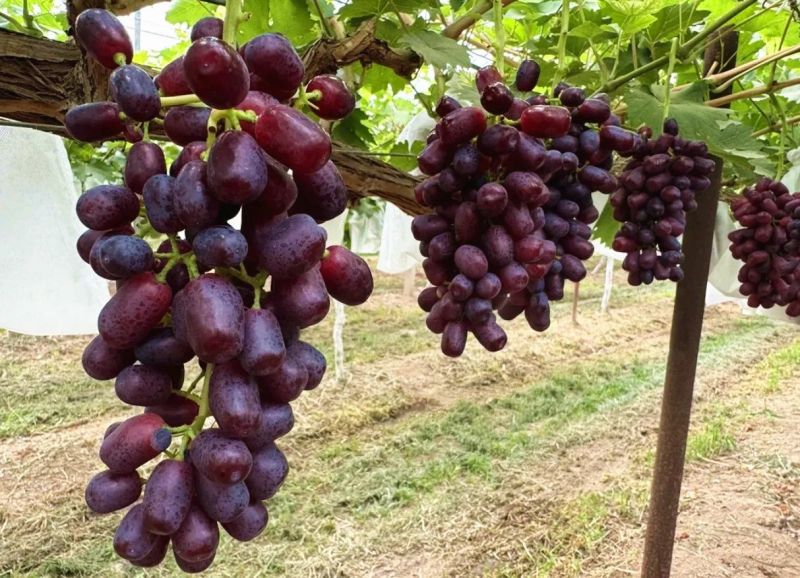 隔壁大棚的夏黑葡萄也完全成熟了,無核“黑珍珠”身披果霜,甜度很高。接下來南太湖、蜜光、戶太8號、巨峰等品種也將依次登場,其中新品種“紹興9號”甜度可達23度,還帶有濃郁的玫瑰香味,非常值得期待。