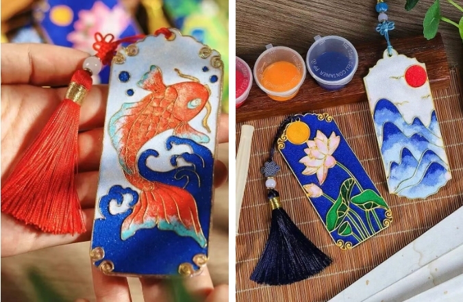 掐絲琺瑯書簽DIY:泛鹢臺提供各式空白書簽,你可以在方寸大小的書簽上描繪色彩,制作一枚承載個人情感與雅致品味的專屬書簽,讓假期記憶變成實用又有意義的小物件。