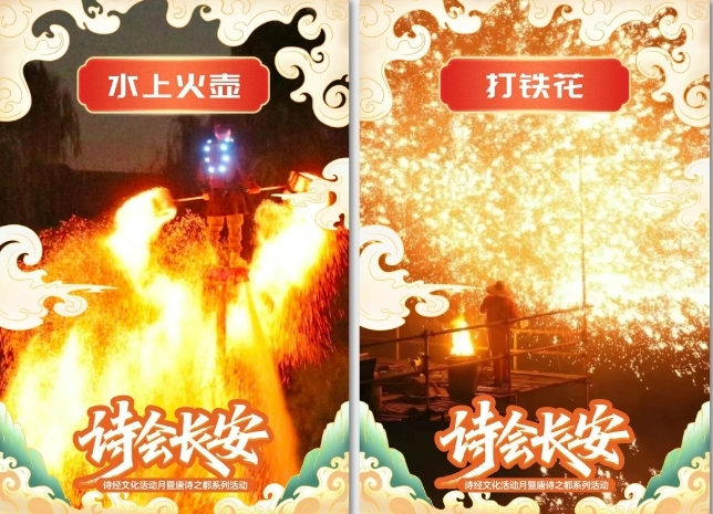 靈沼湖畔:先看水上飛人在光影里表演,接著等非遺打鐵花的“鐵花雨”在夜空炸開,呼應(yīng)“繁光遠(yuǎn)綴天”的意境,緊接著出場(chǎng)的水上火壺表演則將燃燒的火焰化作“火鏈”在水面揮灑,火的剛勁與水的柔婉碰撞出流動(dòng)的詩(shī)畫質(zhì)感。