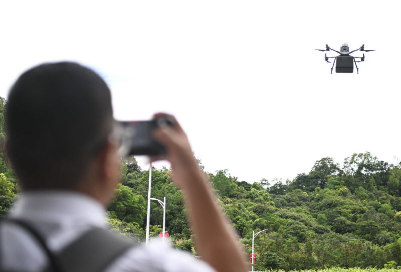 2025年6月26日,參觀者在聯(lián)合飛機(jī)集團(tuán)深圳基地拍攝飛行中的物流無人機(jī)。新華社記者 鄧華 攝