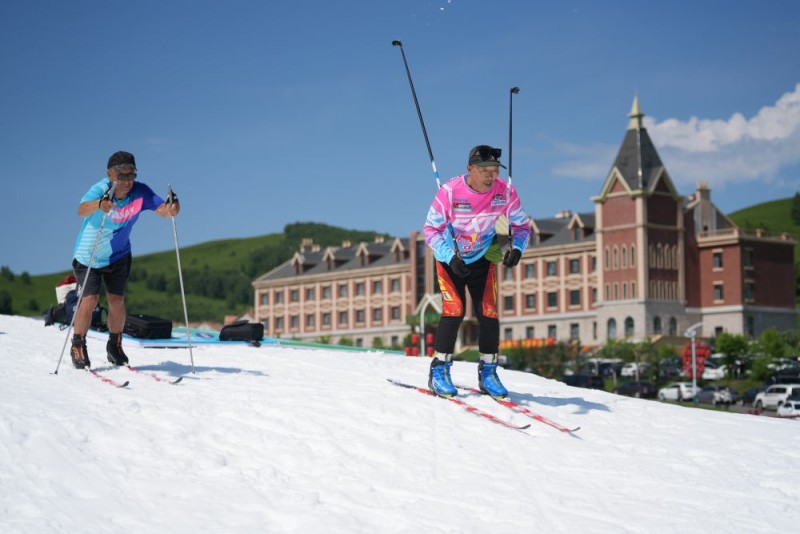 7月11日,兩名滑雪愛好者在內(nèi)蒙古牙克石市鳳凰山景區(qū)的雪道滑雪。當日,內(nèi)蒙古呼倫貝爾市牙克石市鳳凰山景區(qū)啟幕雪夏歡樂季活動。當?shù)乩萌ツ甓緝Υ娴姆e雪,在景區(qū)內(nèi)鋪就一條雪道,以季節(jié)反差為游客營造出獨特的冰雪運動體驗。新華社記者 馬金瑞 攝