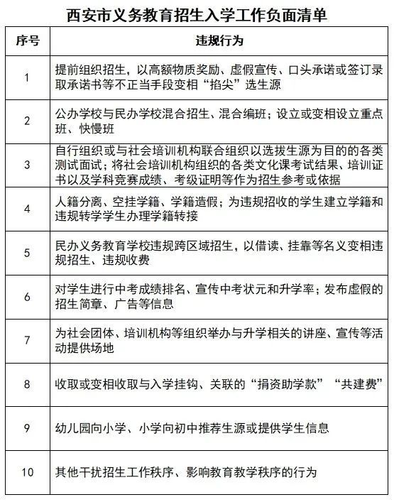 西安市義務教育招生入學工作負面清單