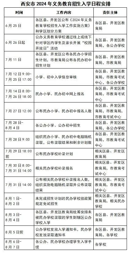 西安市2024年義務教育招生入學日程安排