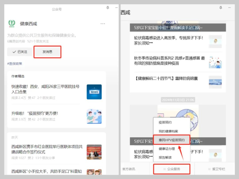 (1)搜索“健康西咸”公眾號,點擊“發消息”,進入菜單欄頁面,點擊“公眾服務”,選擇“惠民HPV疫苗預約”,即可進入“知苗易約”小程序。