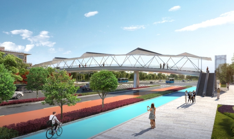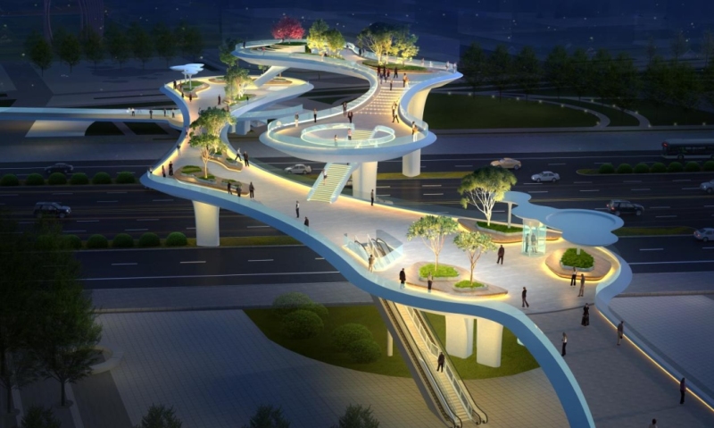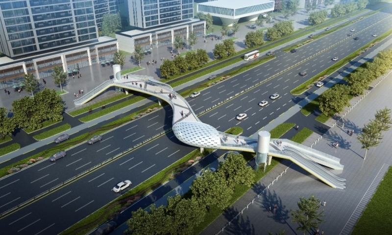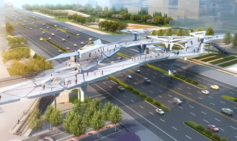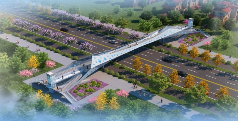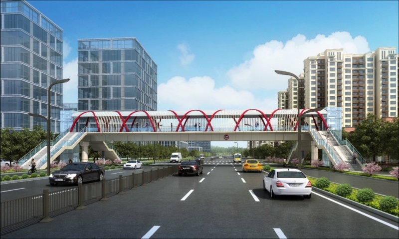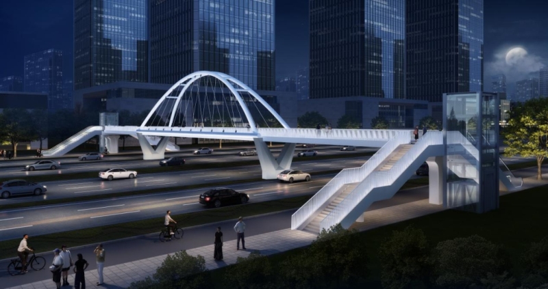 “星際之橋”,取意于具有科技創意感的星際飛船,將科技與創意巧妙融入橋梁設計,整個結構自然、和諧。天橋主橋采用鋼箱梁,橋面鋪裝采用天然石材鋪裝,天橋兩端各設1部無障礙電梯。