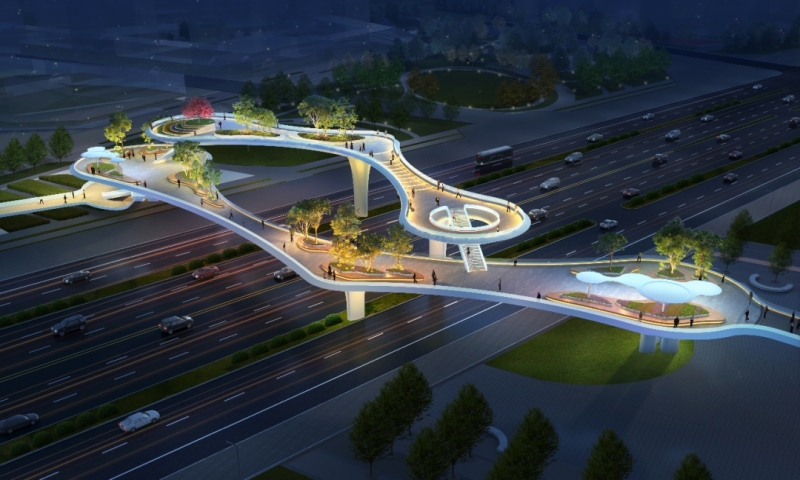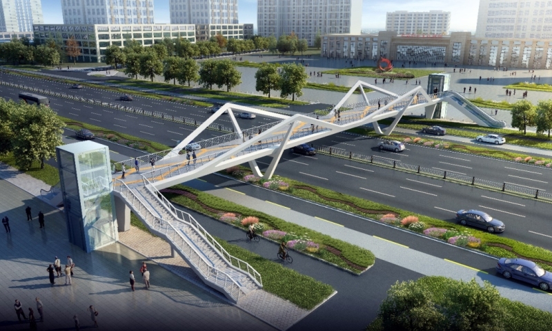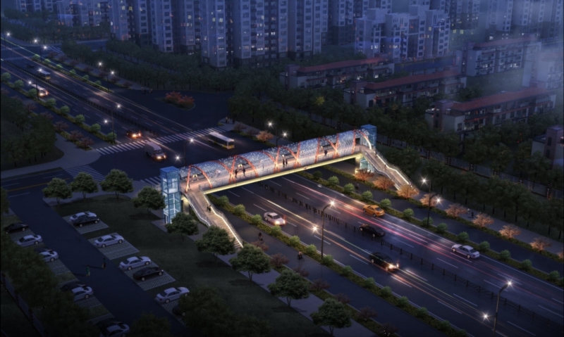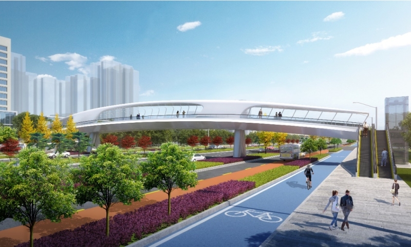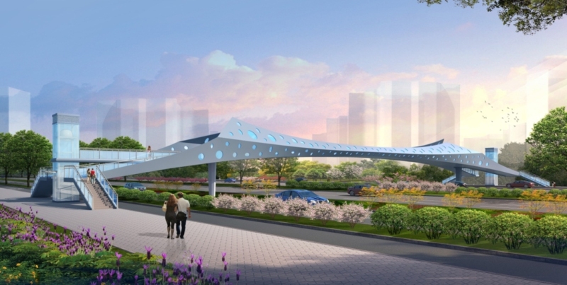 “水韻流動”以曲線為設計手段,著力打造“水韻流動”的感觀效果,波狀形的頂棚與川流不息的車輛和行人呼應,為行人營造良好的過橋體驗。天橋主體采用單箱雙室等高變寬連續鋼箱梁,西南角、東北角設置扶梯,天橋兩邊各設1部無障礙電梯。
