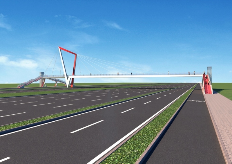 “科技之光”,從科技和經濟發展的折線立意,抽象出一條充滿科技感、空間力學感的折線,形成天橋主體結構,體現了科學與發展的主題。天橋主橋采用單塔斜拉橋,全橋主體結構均采用鋼結構,東西側各設升降直梯1部。
