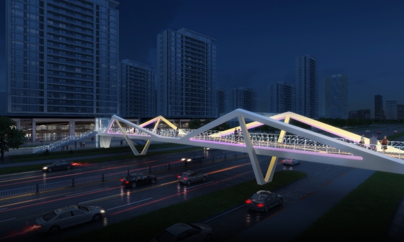 “翼翼飛鸞”,該方案源自詩句:“翼翼飛鸞,載飛載東”,以飛鳥之姿演化創作,抽象成三角拱、V形塔的組合形式,天橋外觀簡單大氣,充滿靈動之美。天橋主體采用三角鋼拱結構,并在主橋兩側加裝升降直梯及自動扶梯,橋梁整體采用淡雅的白色調涂料,鋪裝圖案為淺灰+明黃的菱形紋樣與橋梁結構呼應,欄桿采用簡潔的橫條紋白色欄桿。