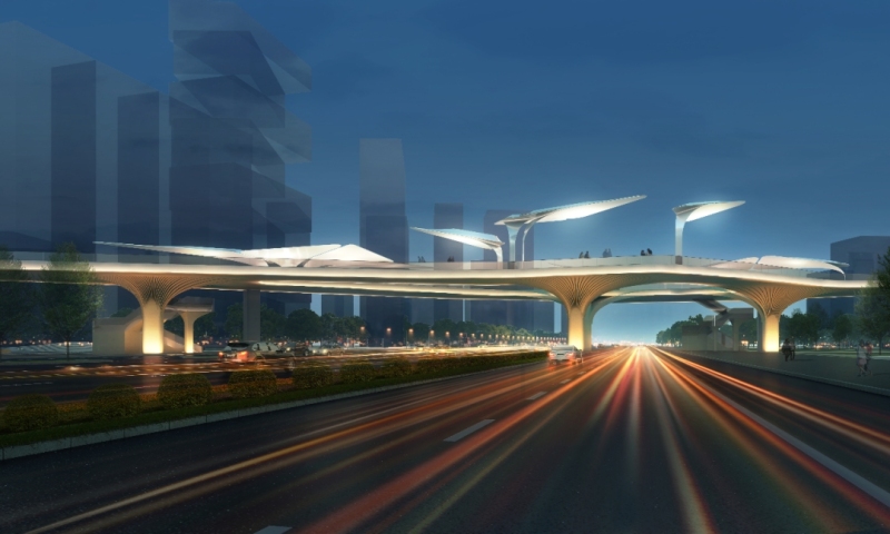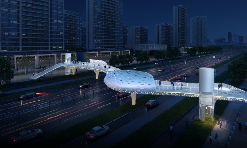 “金聲玉潤”,設計步行道蜿蜒穿行,體現玉潤之形,立柱造型如音樂旋律,用順暢優美的結構變化,展現規律與韻律,體現金聲之美;取金聲玉潤之意,表達文章氣韻優美。天橋主體結構采用芬克式結構,呈環形布置,主橋塔、橋墩以及無障礙電梯呈三角面造型,與立面結構呼應,形成整體清爽干練的造型,天橋整體跨越世紀大道(東段)。