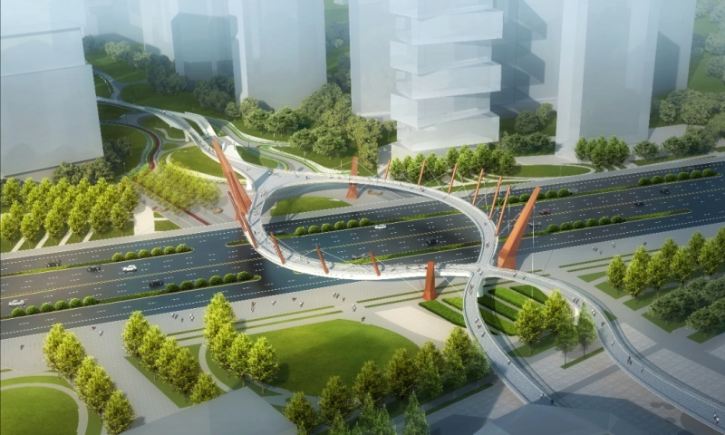 該橋梁位于西咸新區中央軸線與世紀大道(東段)交匯處,屬于世紀大道(東段)跨街天橋,南側為國潤城中心綠地,方便周邊行人通行。