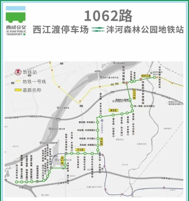 途徑地鐵1號線三期世紀大道沿線的中醫藥大學地鐵站、白馬河地鐵站2處地鐵站,線路輻射灃西新城白馬河路、康定路、豐耘路和世紀大道沿線,覆蓋西咸中心醫院、灃西吾悅廣場、咸陽職業技術學院、康定和園、同德佳苑、西部云谷1期、西部云谷2期、西部云谷3期、宇培物流園、中國西部科技創新港等醫院、商超、社區、學校、產業園區出行密集區域。