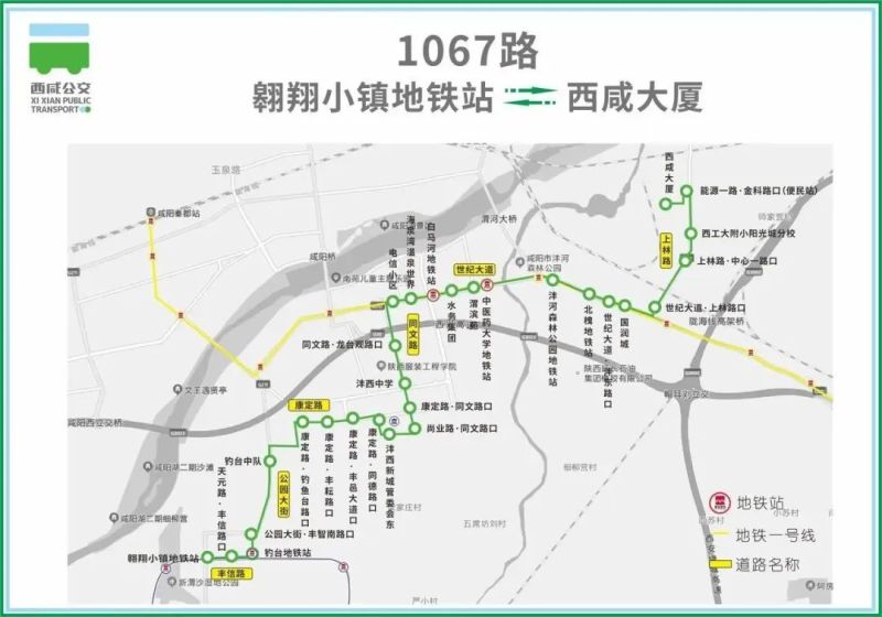 途徑地鐵1號線三期世紀大道沿線的中醫藥大學地鐵站、白馬河地鐵站2處地鐵站,線路輻射灃東新城灃東大道和科源路、灃西新城統一路和同文路、世紀大道沿線,覆蓋金科世界城、萬科大都會、灃水園、灃科花園、芊域溪源、陜西科技大學鎬京學院、陜西服裝工程學院、咸陽職業技術學院、天海星灃東數碼工坊、航天科工西北創新產業園、科創智慧產業園等社區、學校、產業園區出行密集區域。