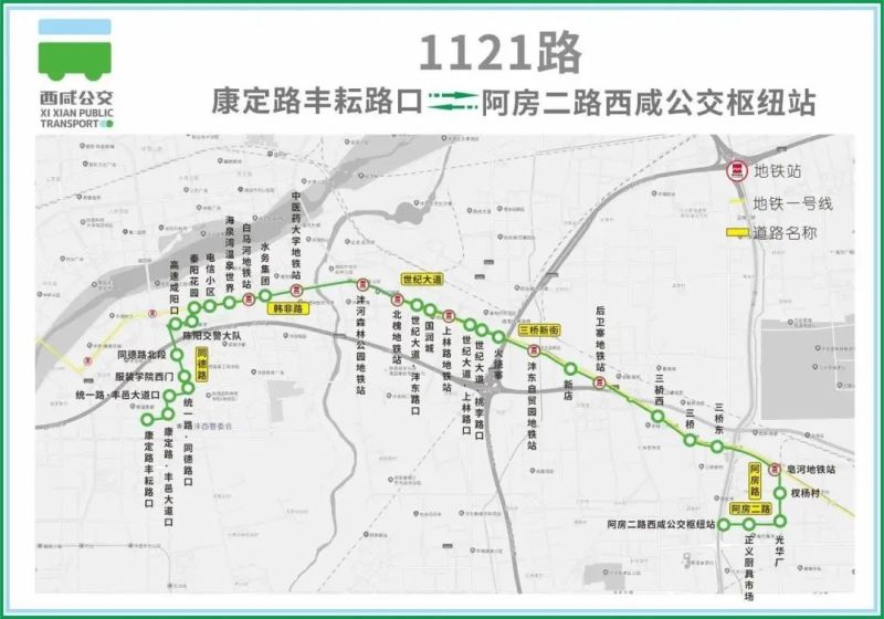 途徑地鐵1號線三期世紀大道沿線的中醫藥大學地鐵站、白馬河地鐵站、陳陽寨地鐵站3處地鐵站,線路輻射灃東新城阿房路和三橋新街、灃西新城同德路、世紀大道沿線,覆蓋萬象城、宜家家居、陳楊新界、金悅城、同德·晨曦園、光華小區、陜西服裝工程學院、陜西國際商貿學院、西部云谷1期等社區、學校、產業園區出行密集區域。