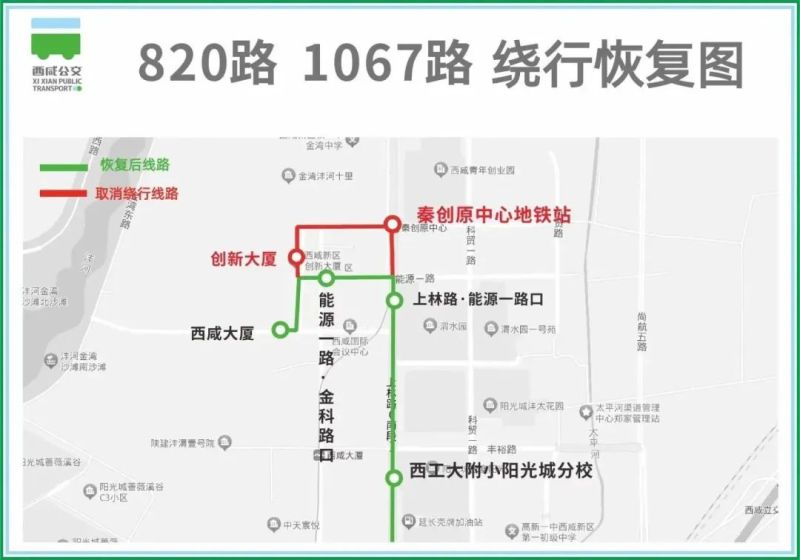 開往西咸大廈方向的820路、1067路,原臨時繞行由上林路、能源二路行駛恢復為由上林路、能源一路行駛至西咸大廈,820路西咸大廈至鄧家村、1067路西咸大廈至翱翔小鎮地鐵站方向保持不變。