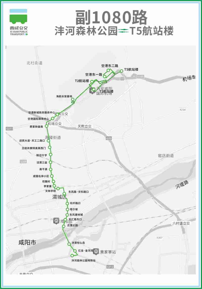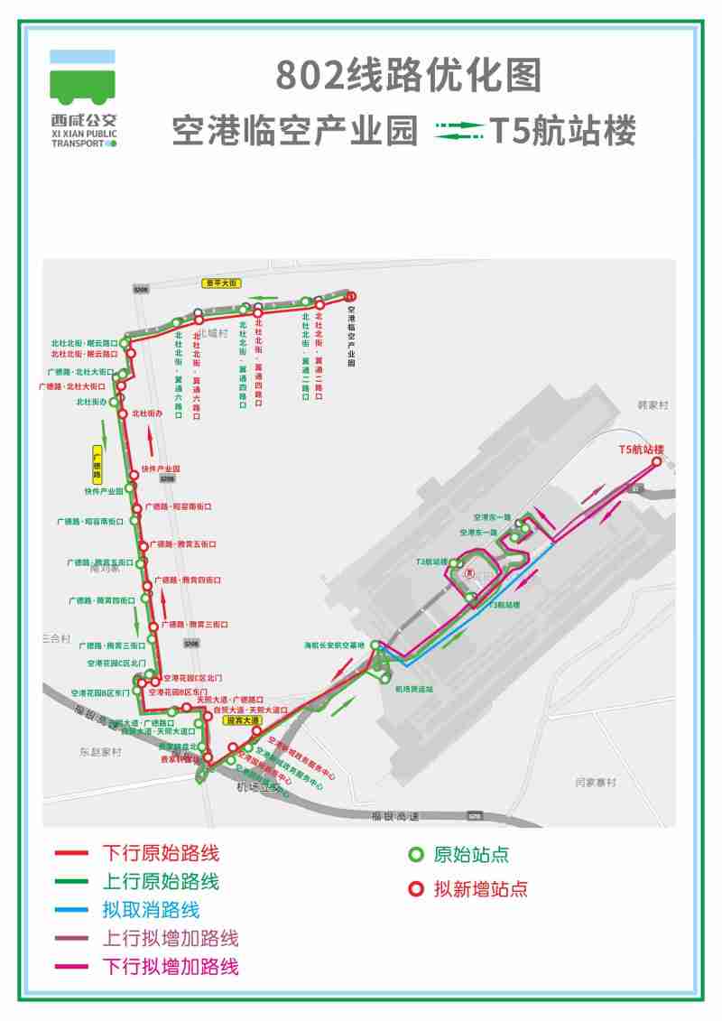 運行線路及沿途下客點:T5—T2—T3—軟件新城(西三環與天谷八路十字)—西港商務中心(地鐵6號線)—陽光新天地(西部大道與博士路十字)—西部大道與西灃路十字—西部大道與子午大道十字—長安區吉源酒店