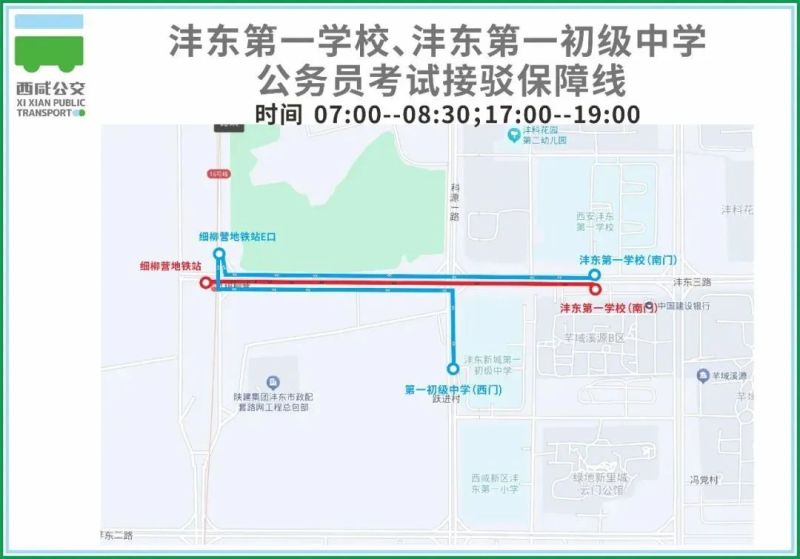 前往“灃東第一學(xué)校”和“灃東第一初級中學(xué)”的考生可以乘坐地鐵16號線到“細(xì)柳營地鐵站”,換乘接駁車至灃東第一初級中學(xué)、灃東第一學(xué)校。