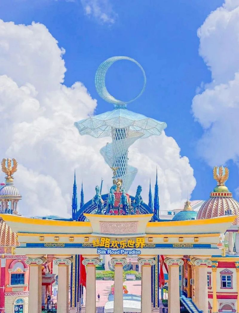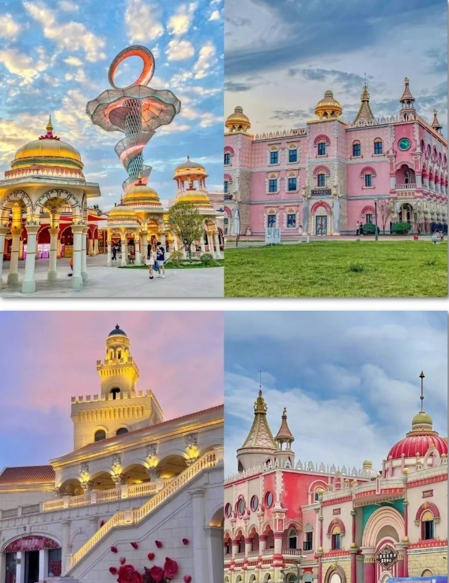 這座以絲路文化為主題的樂園分為七個異域風情街區。園區中,榮耀羅馬區的糖果城堡、陽光希臘的藍白建筑、恒河象谷區的黃金城漂流最出片,日落黃昏乘坐漂流船感受獨有的藍調時刻,仿佛整個世界都安靜下來了。