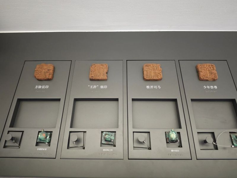 除了木簡,該部分還展出秦漢時期的印章、篆刻、封泥等文物。其中印章部分,展現了古代社會的權力結構與審美趣味。清代藝術家徐堅,形容秦漢印章“壯如鼓劍,細如抽繭”,既有山岳般的堅卓,又有風柳般的婀娜。徐堅認為,刻印的秘訣在于“先章法,后刀法”,前者為形,后者為神,臨摹秦漢官私印,是掌握治印技藝的終南捷徑。