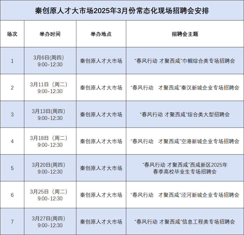 3月份,秦創(chuàng)原人才大市場還將舉辦多場不同主題類型現(xiàn)場招聘會,滿足各企事業(yè)單位和廣大求職者雙選需求,具體場次如下。