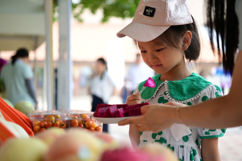 在啟動儀式舉辦地張?jiān)H鹉浅潜ぞ魄f葡萄園區(qū),成排的葡萄架上,一串串飽滿的葡萄綴滿枝頭,令人垂涎欲滴。會場一側(cè),火焰無核、黑密、陽光玫瑰等葡萄晶瑩剔透,水蜜桃、七彩雞蛋、赤松茸醬、搟面皮,茯茶、花卉等一系列特色農(nóng)產(chǎn)品讓人大飽眼福,紛紛駐足圍觀。